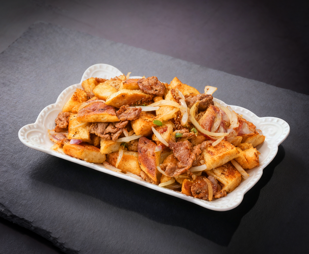 Our Stir-Fried Naan with Beef combines golden-fried naan chunks with tender beef and onions, all tossed in savory spices. A bold and hearty dish with rich aroma and satisfying texture — perfect when you're craving something unique and comforting.
